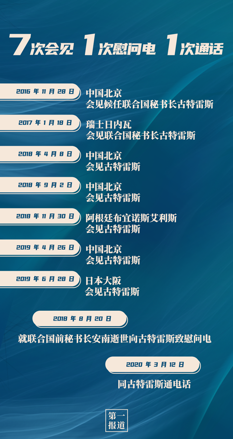 其中,习主席同联合国“掌门人”的交往互动最为频繁,截至目前,习主席已7次会见联合国秘书长古特雷斯。今年,在全球暴发新冠疫情的特殊情况下,习主席还通过“电话外交”同古特雷斯保持沟通交流: