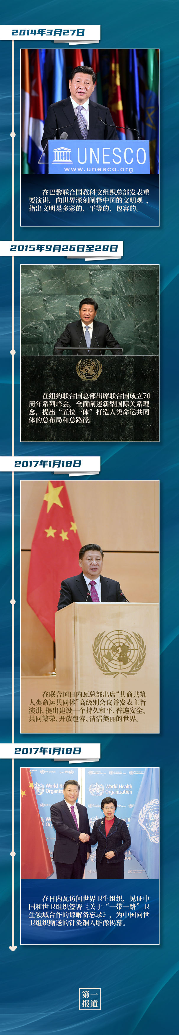 纽约联合国总部、联合国日内瓦总部、联合国教科文组织总部、世界卫生组织,这些地方都留下了习主席的访问足迹。站在联合国讲台,习主席阐述关于促进世界和平发展的重要主张,表达对联合国事业的坚定支持,传递携手各方应对全球挑战、深化多边合作的真诚意愿。