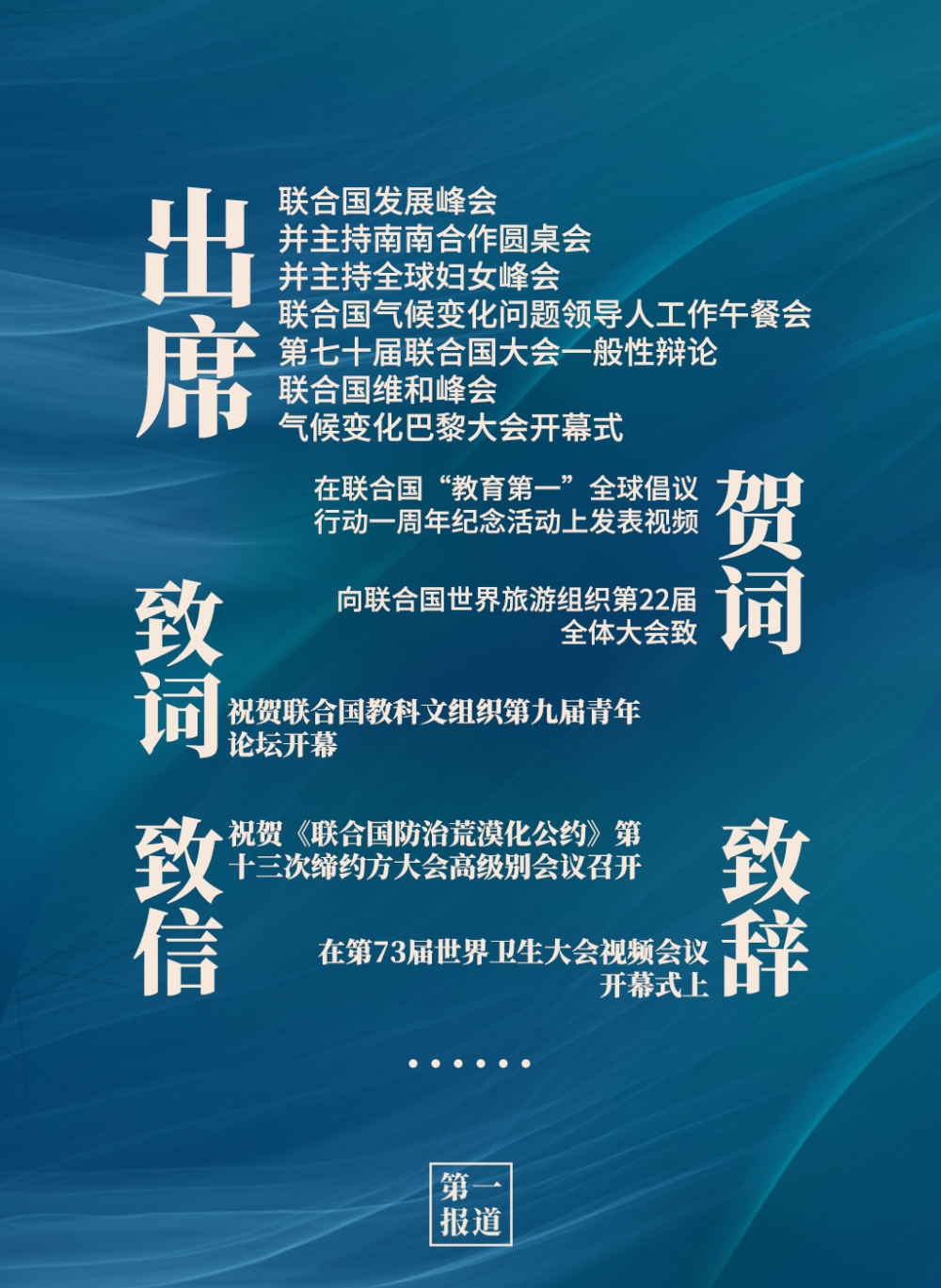 2013年以来,习主席通过出席联合国活动、向联合国活动致信函等方式,进一步深化中国同联合国的合作,为维护世界和平、促进共同繁荣、完善全球治理贡献中国智慧,注入中国动力。