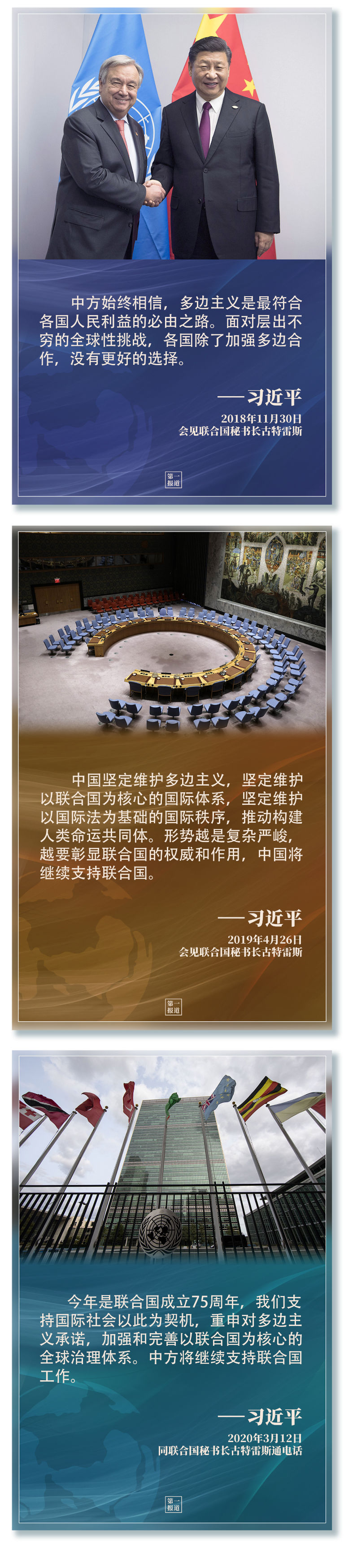 习主席指出,“支持联合国发挥作用,维护联合国权威和地位,是中国外交一项基本政策。”2013年以来,习主席多次会见联合国主要官员,访问联合国总部及联合国专门机构,出席一系列联合国活动……亲自推动中国同联合国的合作,发出支持联合国事业、捍卫多边主义的中国强音。