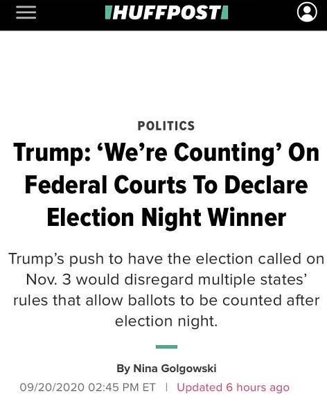 特朗普最近一次表态透露了他对联邦最高法院的“信任”。9月19日在北卡罗来纳举行的竞选集会上,特朗普称,相信联邦法院会保证计票结果在大选结束后数小时内就予以公布,而“不需要在选举一周或两周后还在统计选票”。 众议员唐·拜尔认为,“这是特朗普公开承认希望利用最高法院窃取选举胜利”,如此言论是赤裸裸地“利用联邦法院舞弊,否认民众依法邮寄选票的权利”。