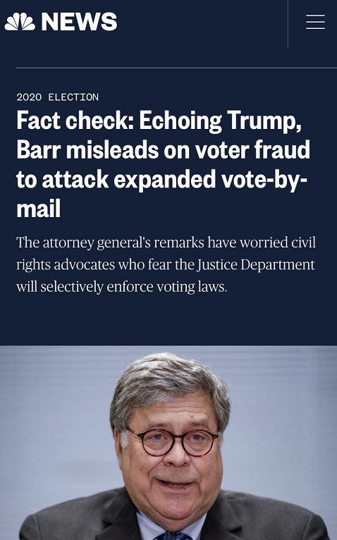 美国全国广播公司同时指出,美国司法部部长威廉·巴尔一直以来与特朗普一唱一和,已经令人担心民主的命运,而他就邮寄选票问题更是提出了“一系列误导性或毫无根据的主张”,破坏了民众对选举和法治的信心。报道列举了巴尔和特朗普二人相互附和的多条谣言,其中包括:美国没有大面积处理邮寄选票的经验、邮寄选票会引发大面积选民欺诈、外国势力介入操控等。