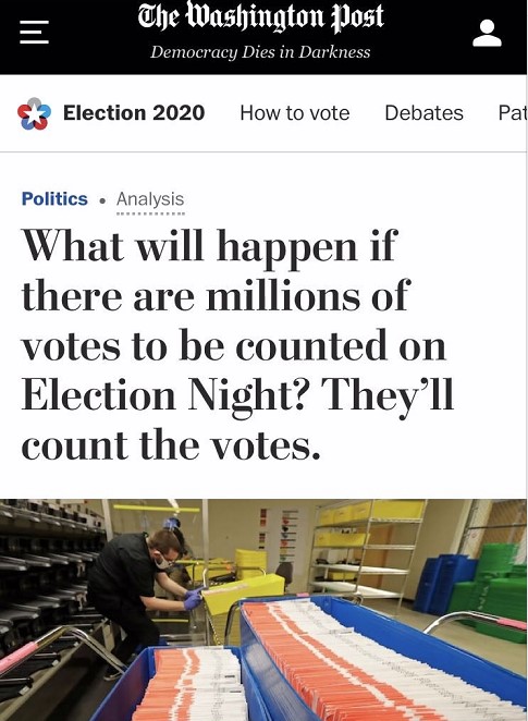 《华盛顿邮报》指出,没有州和地方的选务认证,大选就没有正式完成,而疫情之下的选举认证很可能将需要数周,但人们可能已经习惯了不必等待,“特朗普正是希望利用这个优势”,“如果数百万美国人真的同意特朗普的说法,认为不用等待计票就能得出选举结果,那可能才是真正的灾难”。