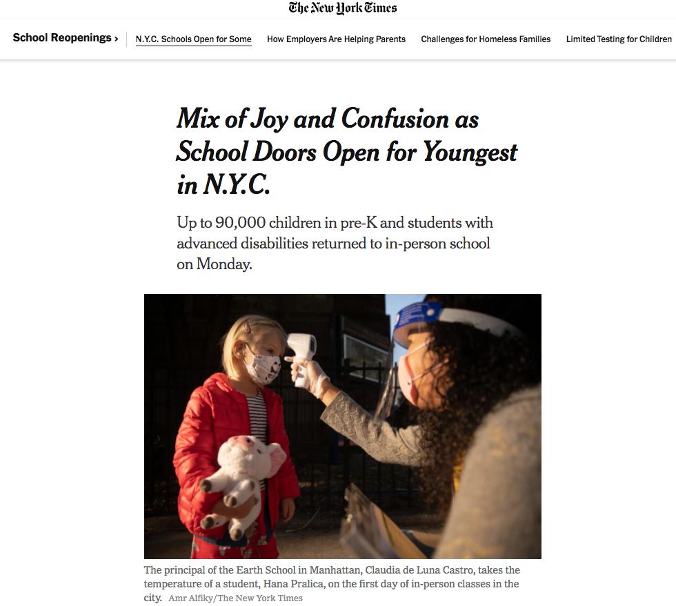 据《纽约时报》报道,整个八月,纽约市政府都在就何时开学,怎么开学进行激烈的讨论。各方争执不下,重新开学的日期也一推再推;教育界人士对此纷纷表示担忧,认为学校和社会都没有办法或者有效防护措施保证学生及教职工的安全。