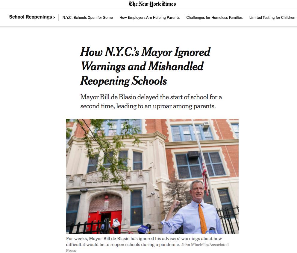 △据《纽约时报》报道,市长德布拉西奥无视警告,强行重启校园。