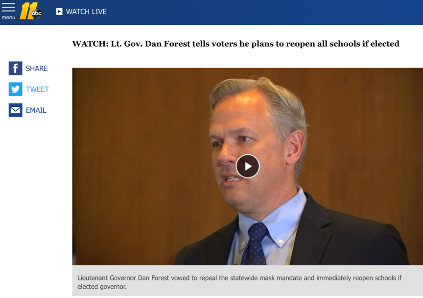 △据美国广播公司报道,北卡罗来纳州副州长丹·弗雷斯特告诉选民,他计划在当选后重新开放所有学校,并禁在全州范围内废除口罩强制令。