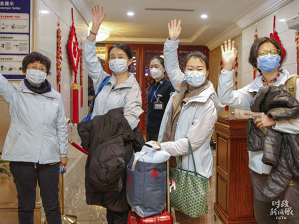 △2月1日,北大第三医院院长乔杰(左一)和同事在首都机场向送行者挥手告别。