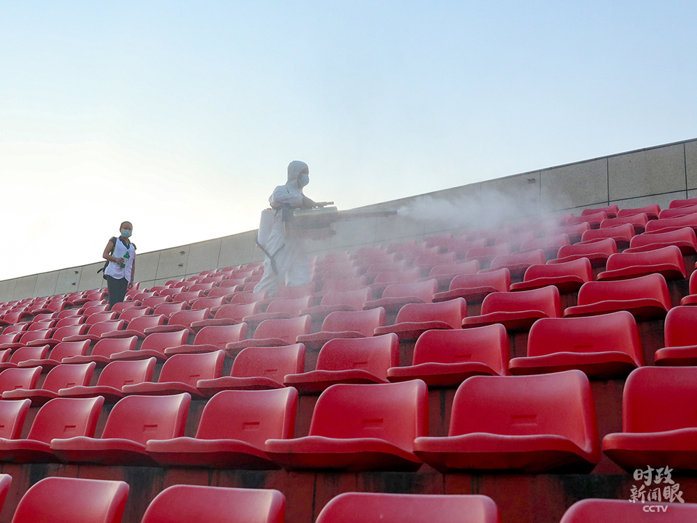 △四川广安某学校义工在开学前为操场看台消毒杀菌。
