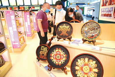 海口美兰国际机场出发厅里,400余种海南特色旅游商品向来往旅客集中展示和推广。