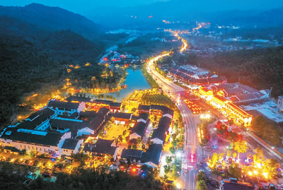 浙江湖州长兴县水口乡茶文化景区灯光璀璨,夜经济红火。