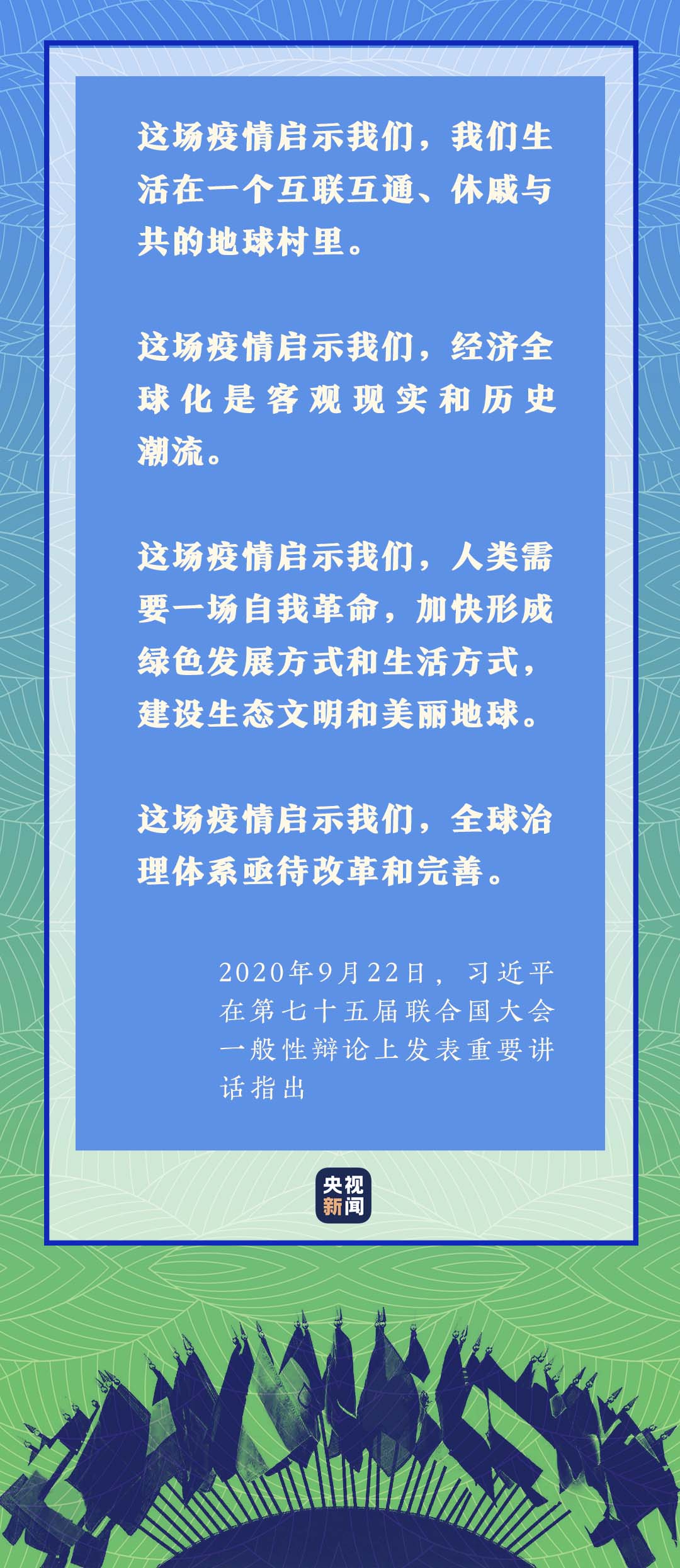 “各国人民守望相助,展现出人类在重大灾难面前的勇气、决心、关爱,照亮了至暗时刻。”习近平主席在第七十五届联合国大会一般性辩论上,深刻总结疫情带来的重要启示,进一步回答了“世界怎么了、我们怎么办”的时代之问。