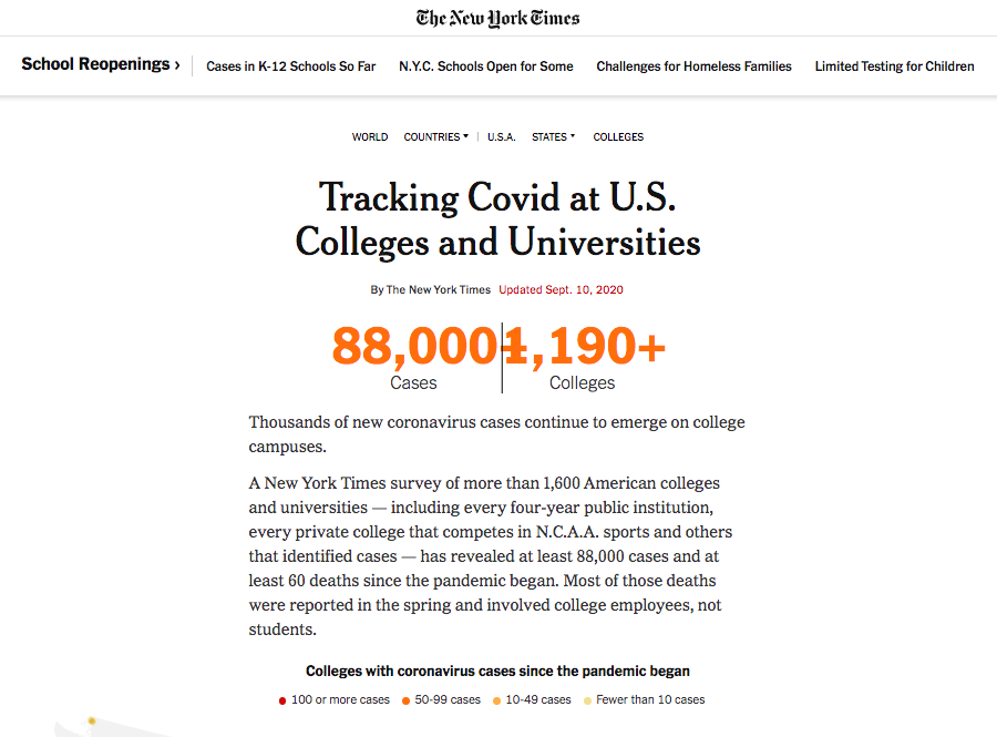 据美国约翰斯·霍普金斯(Johns Hopkins)大学最新统计,截止到当地时间9月23日,美国累计新冠肺炎确诊病例近694万,累计死亡人数超20万。据《纽约时报》(The New York Times)的疫情追踪数据显示,美国高等院校中已有至少8.8万例确诊病例,超1190所高校受影响。新学年强制开学,更是使稍显平稳的疫情重新进入紧急状态。美国社会各界对学校防疫能力表示质疑。《纽约时报》称,学校不是孤岛,随着秋季重启校园,新冠肺炎必定会二次暴发。