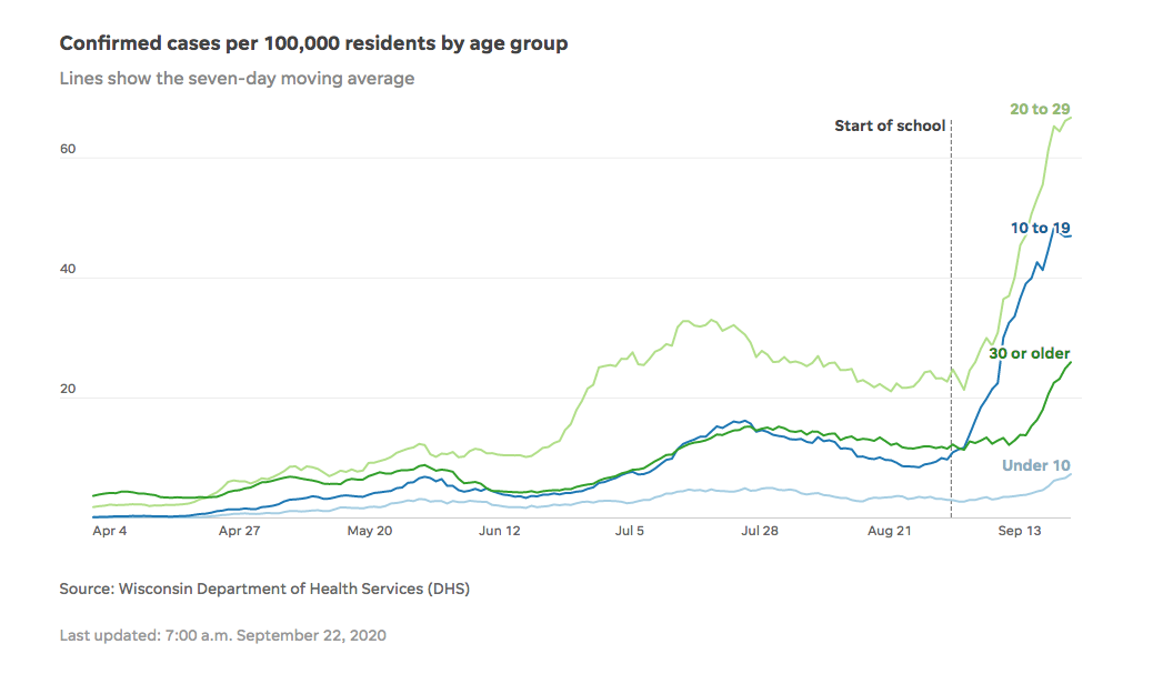 △威斯康星州(Wisconsin)卫生服务部的统计数据显示,自该州的大学校园陆续重启后,新冠新增感染病例开始直线上升。
