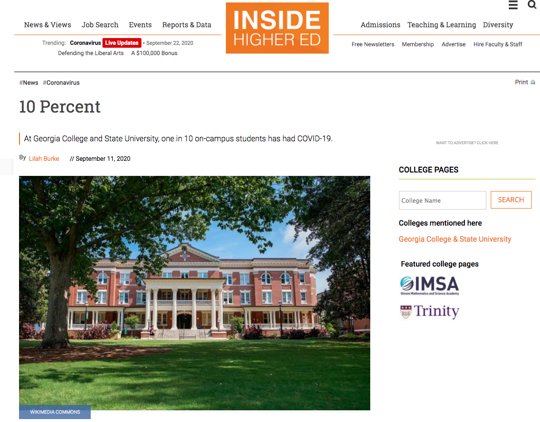 △据《走进高等教育》(Inside Higher ED)报道,在佐治亚学院和佐治亚州立大学,每10名在校生中就有1人感染新冠。
