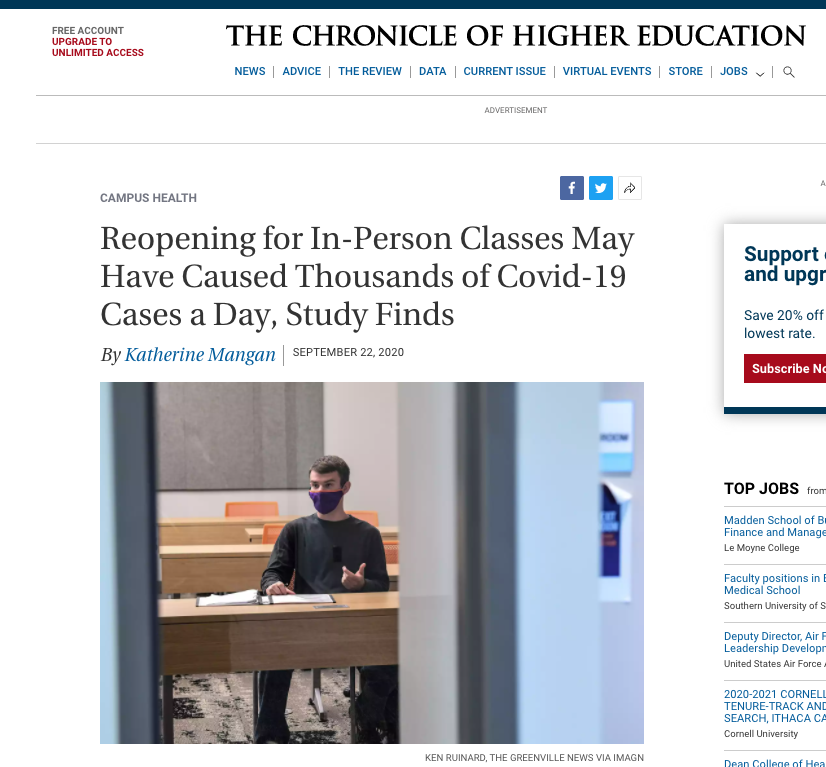 《高等教育纪事》(The Chronicle of Higher Education)称,美国流行病学、健康经济和高等教育的人员在戴维森学院(Davidson College)、印第安纳大学布卢明顿分校(Indiana University at Bloomington)、北卡罗来纳大学格林斯堡分校(The University of North Carolina at Greensboro)和华盛顿大学(The University of Washington)进行的一项研究得出,重新开放面对面教学,可能已导致这些大学校园里每天新增约3200个新冠感染病例。