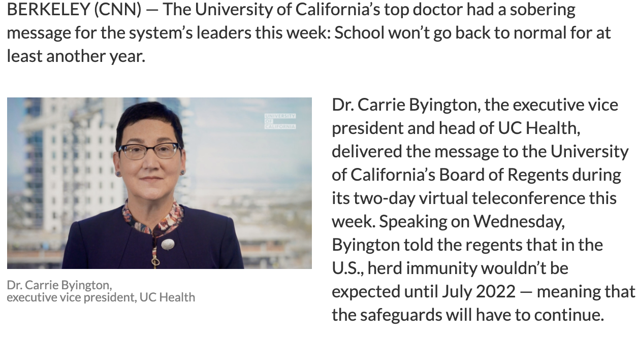 据美国有线电视新闻网报道,加州大学(UC)的资深医生凯莉·比灵顿(Dr.Carrie Byington)多次向政府发出警告并预测道,美国学校至少一年后才能恢复正常,直到2022年7月才有望实现群体免疫。