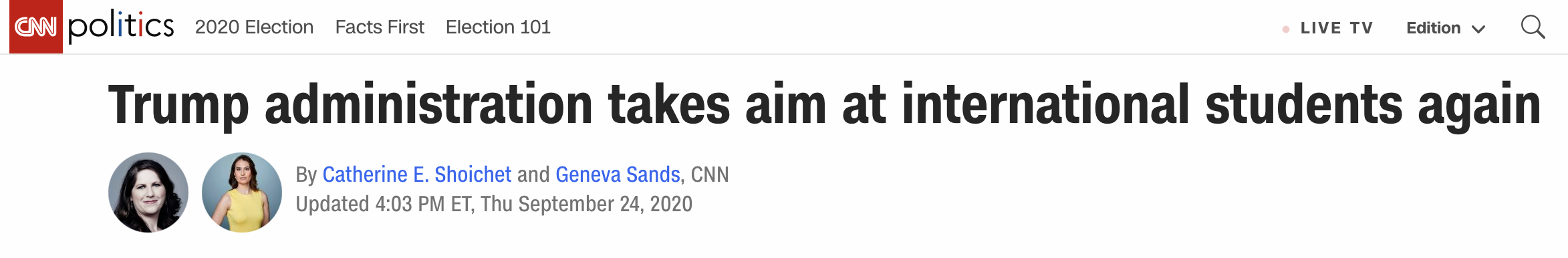 CNN报道称,这并非特朗普政府首次拿留学生“开刀”。今年7月,美国政府曾出台一项涉留学生签证的新规,称不会给在秋季学期仅上网课的留学生发放签证,也将不允许这些学生进入美国。