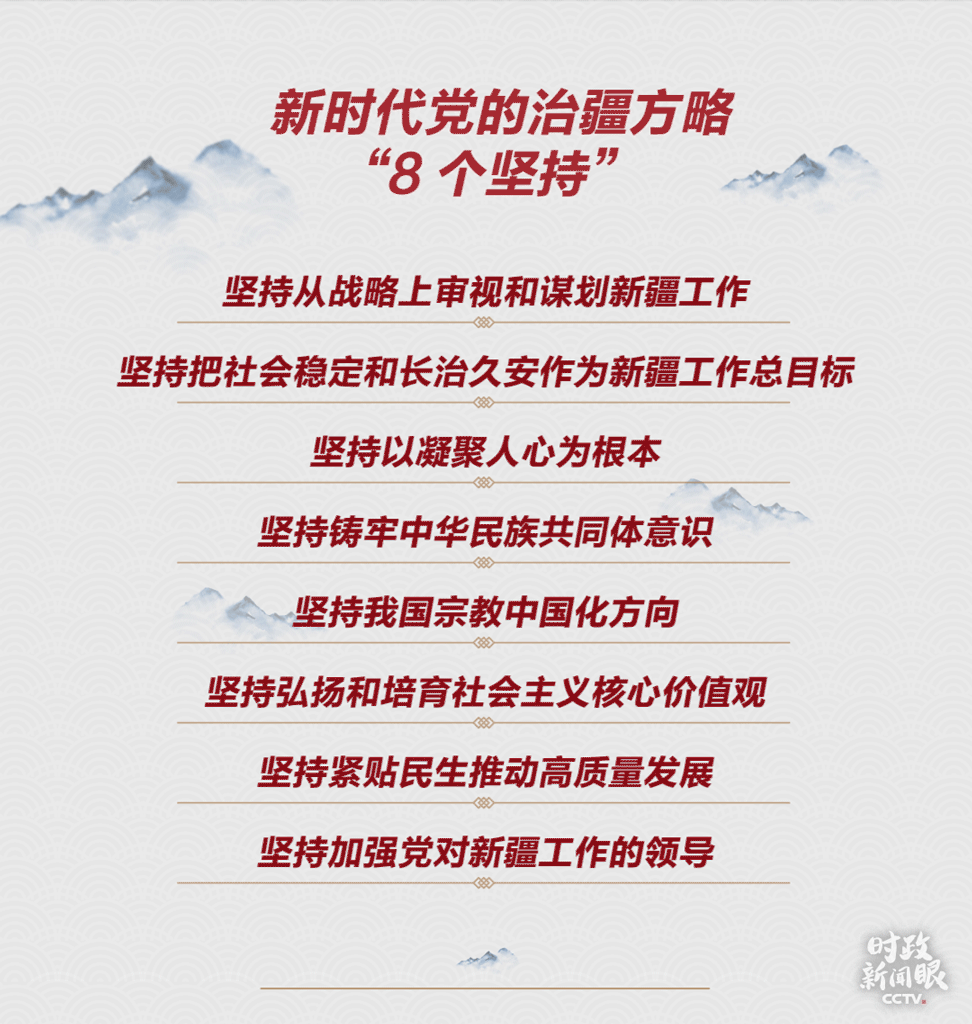 就在此次座谈会一个月前,总书记在中央第七次西藏工作座谈会上以“10个必须”概括了新时代党的治藏方略,其中写入了总书记多次谈到的战略思想:“治国必治边、治边先稳藏”。而在新时代党的治疆方略中,也重申了多次强调的新疆工作总目标:“社会稳定、长治久安”。
