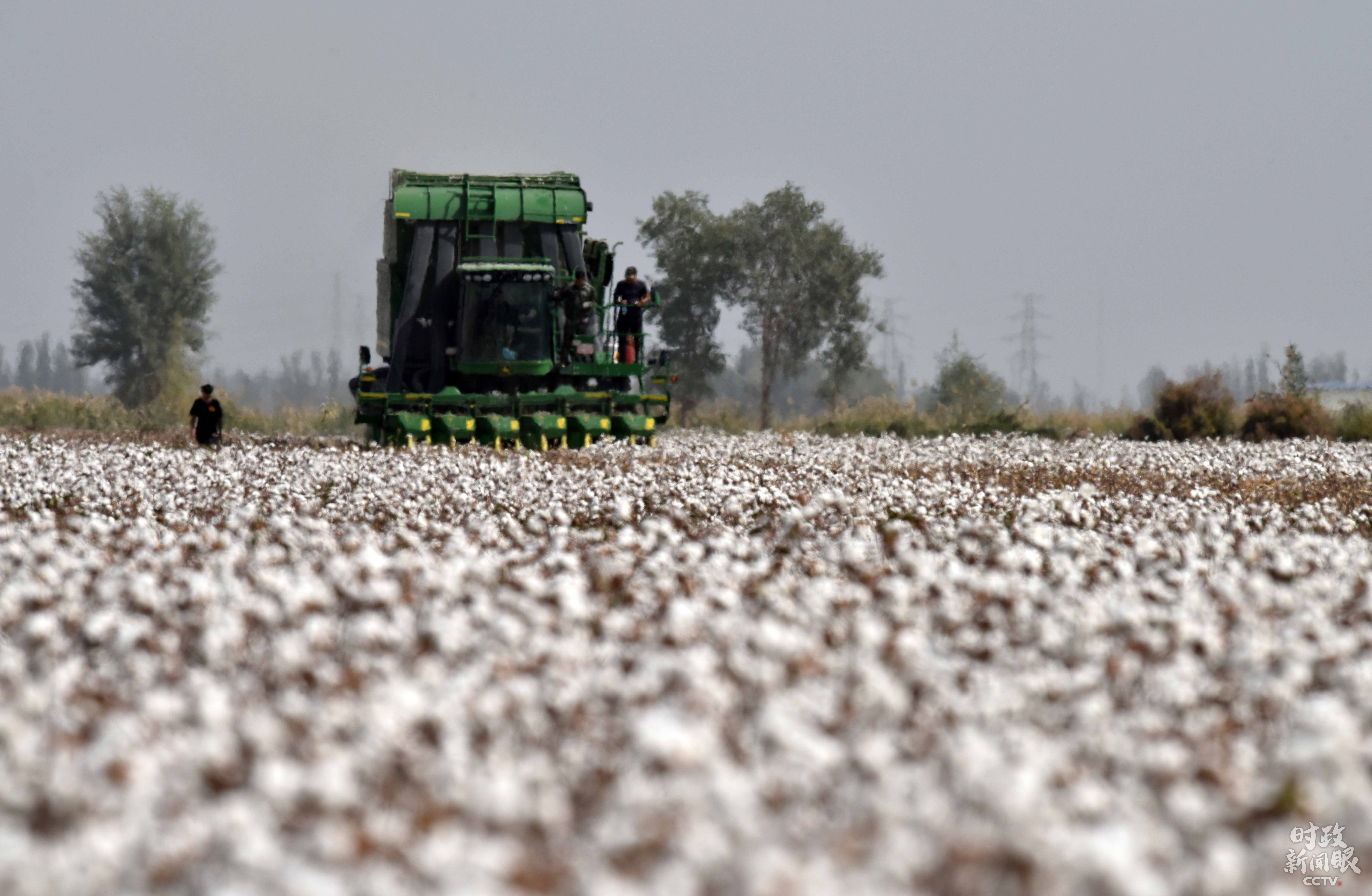 △新疆库尔勒市普惠农场内,大型采棉机正在采收棉花。