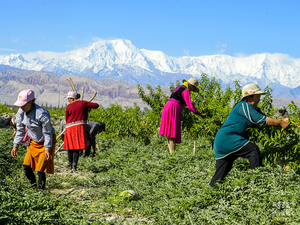 △新疆阿克陶县村民在林果基地为桃树打枝,林间同时套种了西瓜。