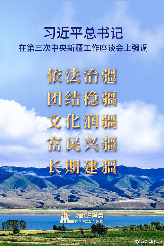 细心的人们不难发现,这次座谈会则将有关要求拓展为“依法治疆、团结稳疆、文化润疆、富民兴疆、长期建疆”,增加了“文化润疆”和“富民兴疆”。