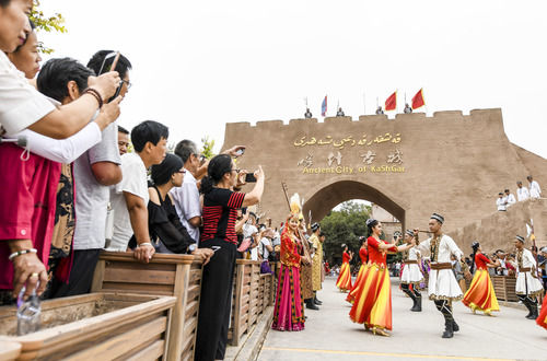 在新疆喀什古城景区“开城”仪式上,游客在观看歌舞表演(2019年8月13日摄)。新华社记者 王菲 摄