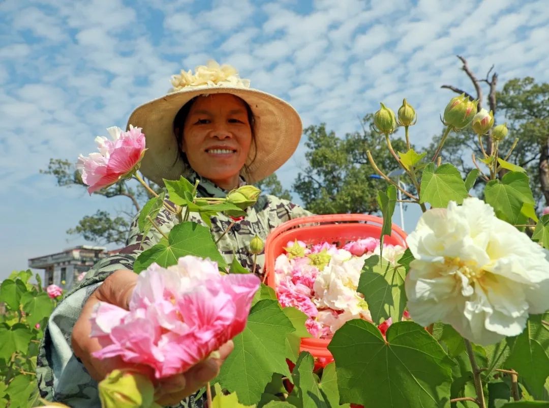 △2019年11月11日,江西省吉安市泰和县灌溪镇田心村农民正抢抓晴好天气采摘芙蓉花。