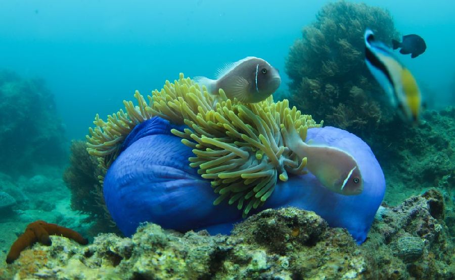 这是2020年5月28日在中国海南三亚蜈支洲岛海域拍摄的与海葵共生的小丑鱼。新华社记者 杨冠宇 摄