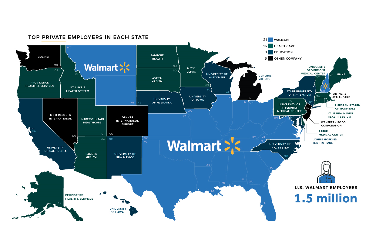 过去四十年,低收入人口中制造业的就业比例下降了50%, 而服务业的就业比例上升了20%。如果不考虑各级政府的就业人员,沃尔玛在美国22个州是最大雇主。美国雇佣劳动力最多的10个企业中,有6个是连锁超市或者快餐店,没有一个制造企业。