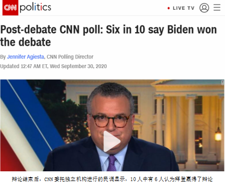 在这场被称为有史以来最混乱的辩论结束后,CNN委托独立机构SSRS进行的辩论民调显示,每10名观众中,就有6人认为拜登表现较好,只有28%的受访者认为特朗普表现较好。与此同时,65%的受访者认为拜登的回答比特朗普更真诚,只有29%的受访者认为特朗普讲了真话。另外,整体而言,69%的受访者认为拜登对特朗普的攻击比较公平,只有32%的受访者认为特朗普的攻击是公平的。(央视记者 顾乡)