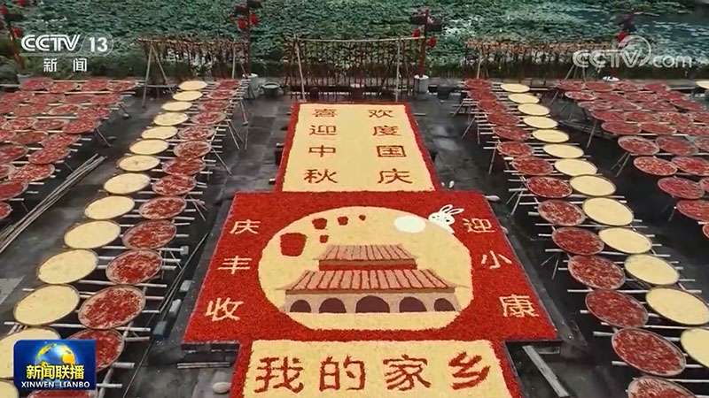 “双节”喜相逢,家国共团圆。安徽黄山呈坎村的晒秋习俗已经延续了数百年,村民将玉米、辣椒等作物拼出各种文字和图案,传递国家富强、小家兴旺的喜悦心情。在新疆库车,援疆干部和社区居民聚在一起跳起欢快的麦西来甫。在河南南阳岳家村,志愿者给留守儿童送去月饼,陪伴他们温暖过节。在河北正定旺泉古街,上千名市民游客一同分享一个直径2.4米的巨型月饼,开心和幸福洋溢在每个人的脸上。