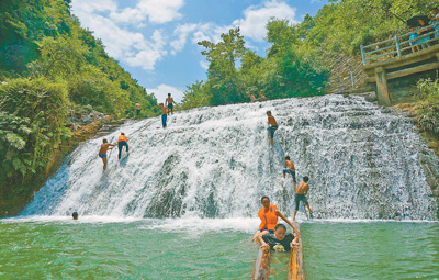 游客在凤凰县菖蒲塘村飞水谷景区瀑布游玩。摄于2014年8月。