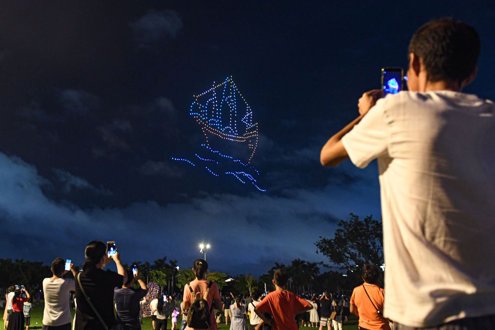 ↑10月2日,人们在海口市万绿园观看无人机灯光秀表演。 新华社记者 蒲晓旭 摄