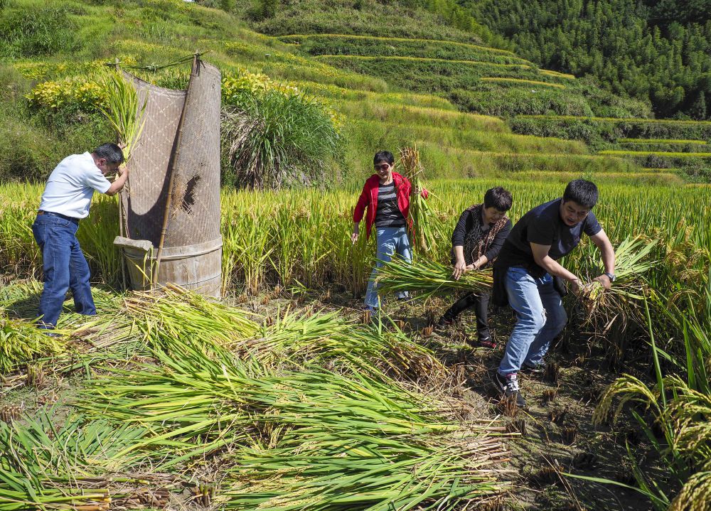↑10月3日,在景宁县小佐梯田,来自上海的游客体验收割水稻。新华社发(李肃人 摄)