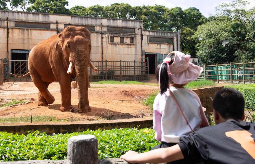 ↑10月4日,游客在昆明动物园内观看亚洲象。新华社发(王冠森摄)