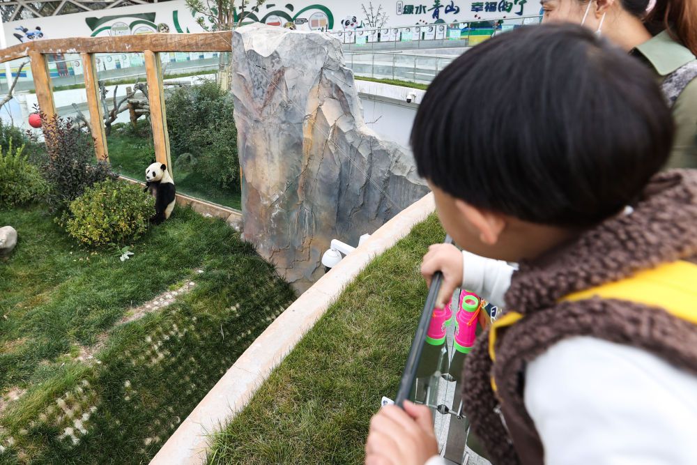 ↑10月4日,游客在西宁熊猫馆内观看熊猫。新华社记者 吴刚 摄