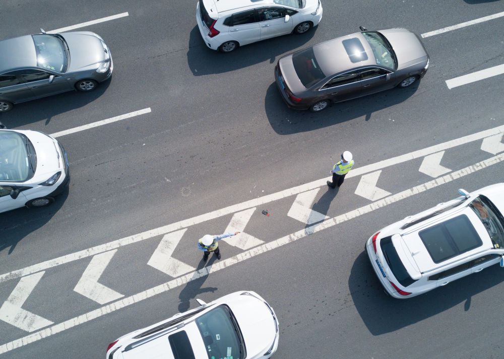 ↑10月1日,在福州螺洲大桥出城方向,交警疏导交通(无人机照片)。新华社记者 宋为伟 摄