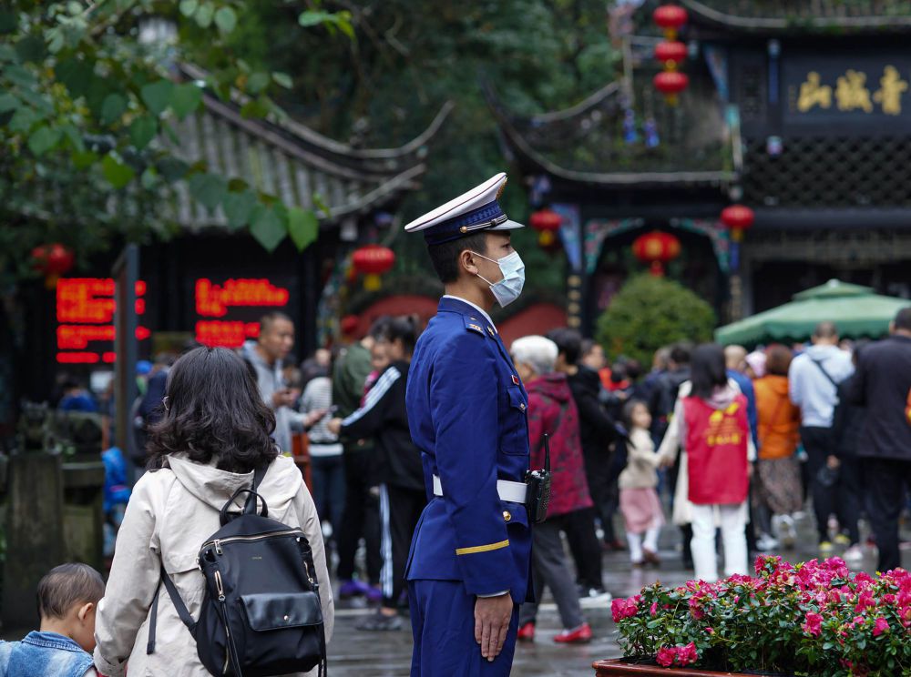 ↑10月4日,四川森林消防总队特勤大队一中队消防员在青城山-都江堰景区执勤。新华社记者 江宏景 摄