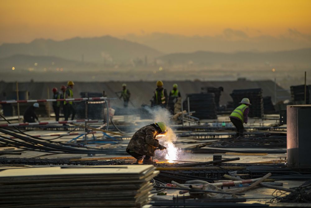 ↑在新疆乌鲁木齐机场改扩建工程航站楼施工现场,中建三局的工人在焊接钢筋(10月2日摄)。新华社记者 胡虎虎 摄