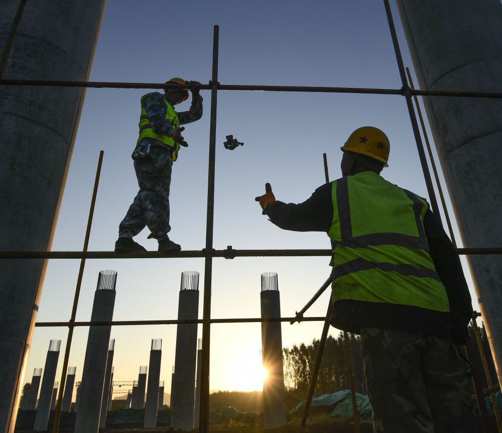 ↑10月4日清晨,工人在京秦高速公路工程遵秦段遵化境内施工。新华社发(刘满仓 摄)