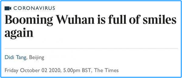 英国《泰晤士报》网站于10月2日发表的题为《蓬勃发展的武汉再次充满欢声笑语》的报道表示,国庆来临,在武汉出现新冠肺炎疫情半年多后,这座城市再度充满了活力。