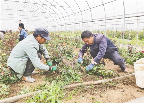 甘肃定西市渭源县上湾镇南谷玫瑰园内,工人正在为玫瑰花除草。 经济日报·中国经济网记者 薛志伟摄
