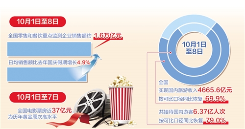 经济日报-中国经济网北京10月8日讯(记者冯其予 张雪 陈果静 常理)来自商务部的数据显示,今年国庆中秋假日期间全国各地在做好疫情防控前提下,积极组织开展丰富多彩的促消费活动,消费需求加快释放,市场人气持续攀升,国内大循环活力强劲。10月1日至8日,全国零售和餐饮重点监测企业销售额约1.6万亿元,日均销售额比去年国庆假期增长4.9%。同时,来自中国银联的数据显示,10月1日至7日,银联网络的交易金额达到2.16万亿元,较去年同期增长了6.3%。
