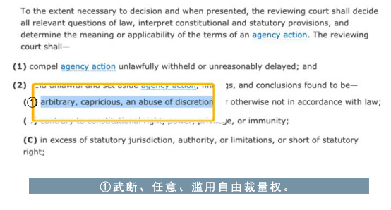 当法院认定政府机构的行为“武断、反复无常、滥用自由裁量权或在其他方面不符合法律规定”、“超过法定标准”或者“未遵守法律规定的程序”时,有权判定该行为违法。