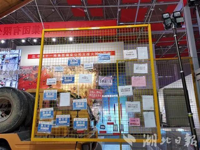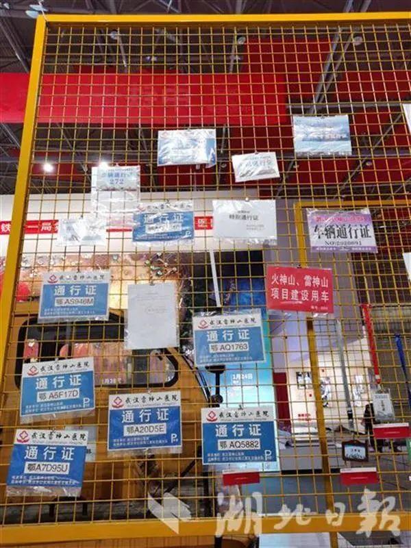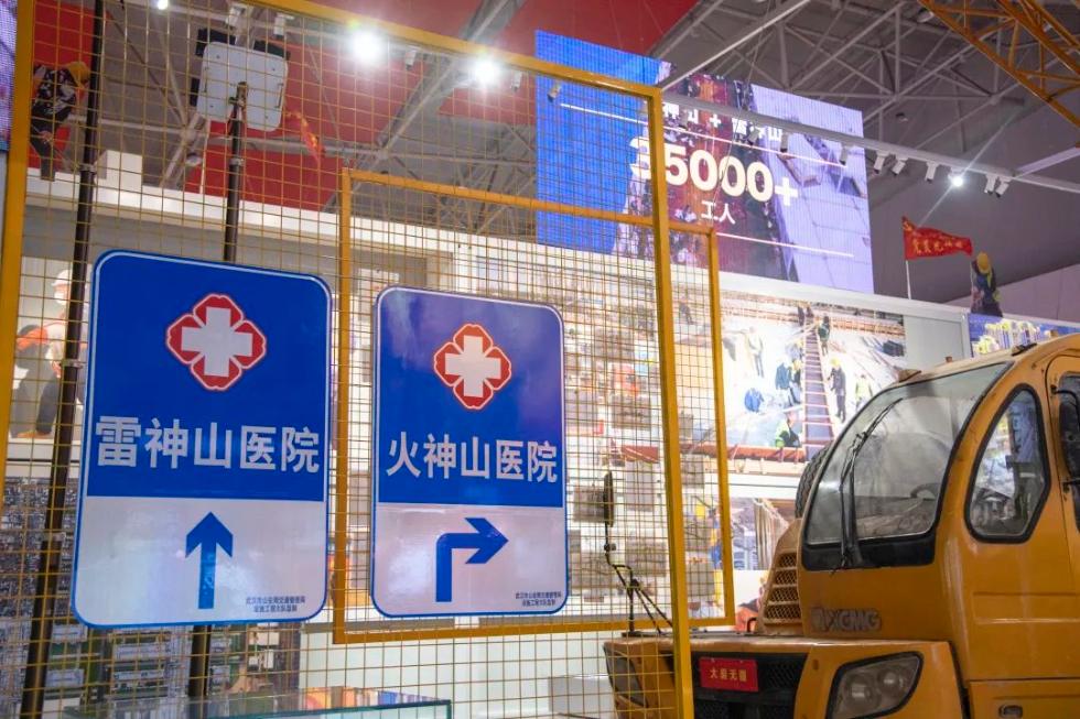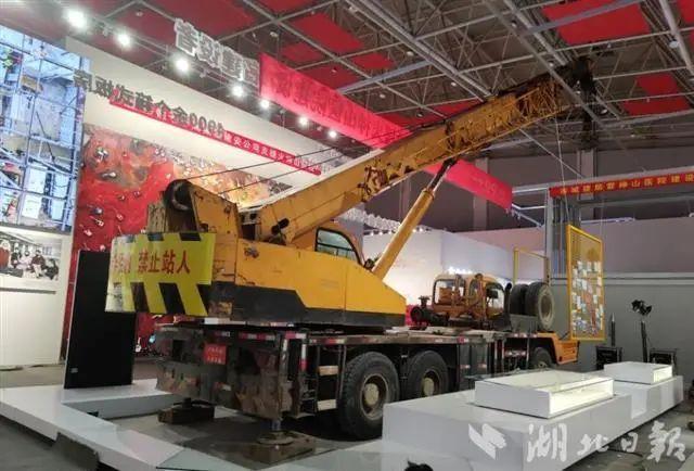 展览还原火神山医院、雷神山医院建设的场景,大型吊车、病房、车辆通行证、工作服等实物均被搬到现场。