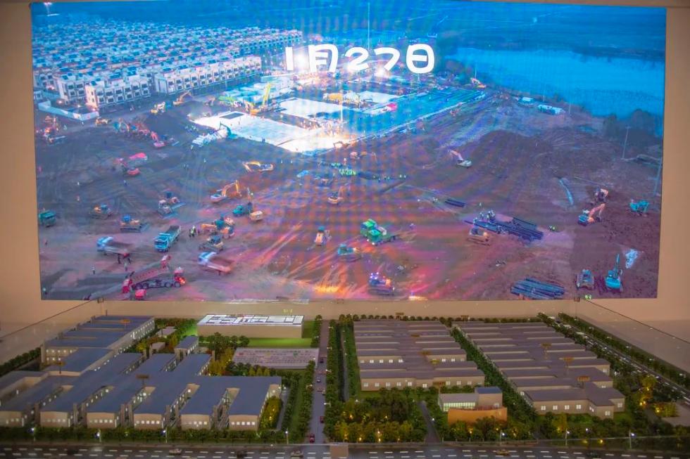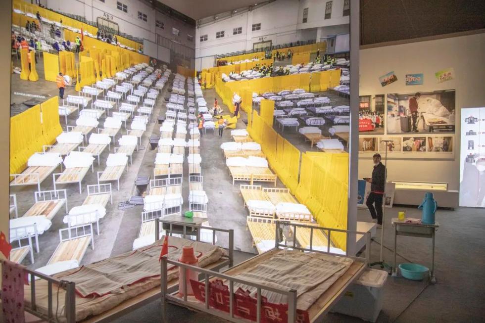 同时,通过沙盘模型、照片、视频等,展现约4万名建设者从八方赶来,用10天左右时间建成“两山”医院的壮举。