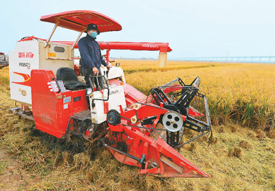 图为10月16日,在山东省青岛市城阳区上马街道稻作改良示范基地,工人驾驶收割机收割海水稻。