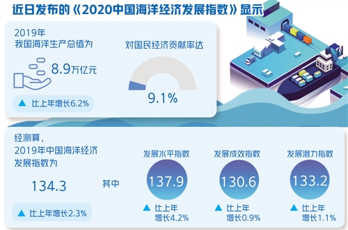 国家海洋信息中心近日发布的中国海洋经济发展指数显示,我国海洋经济规模持续扩大,2019年海洋生产总值为8.9万亿元,比上年增长6.2%,对国民经济贡献率达9.1%。