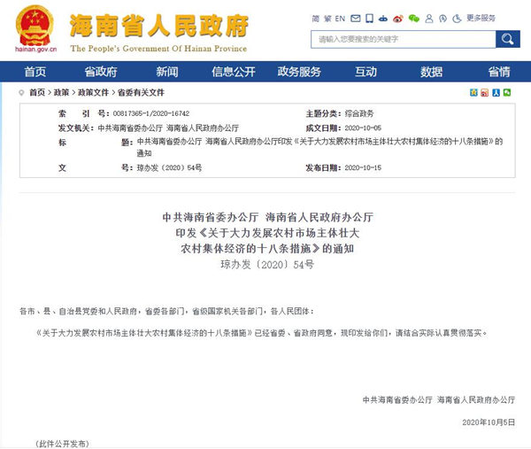 海南发布十八条措施大力发展农村市场主体 壮大农村集体经济