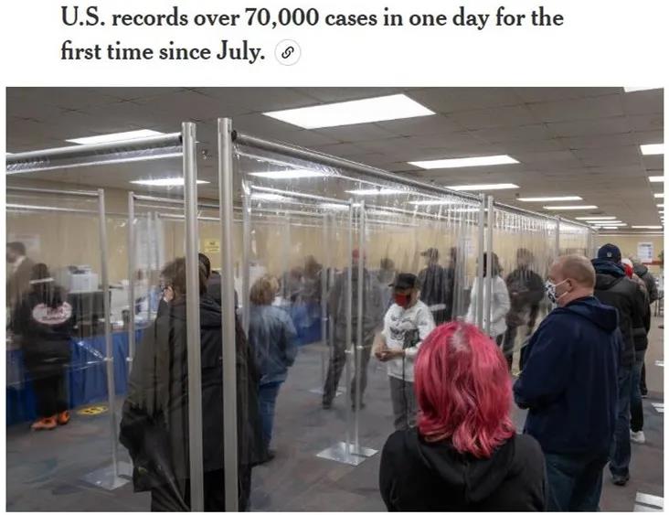 △《纽约时报》报道:美国单日新增病例数自7月以来首次超过7万纪录